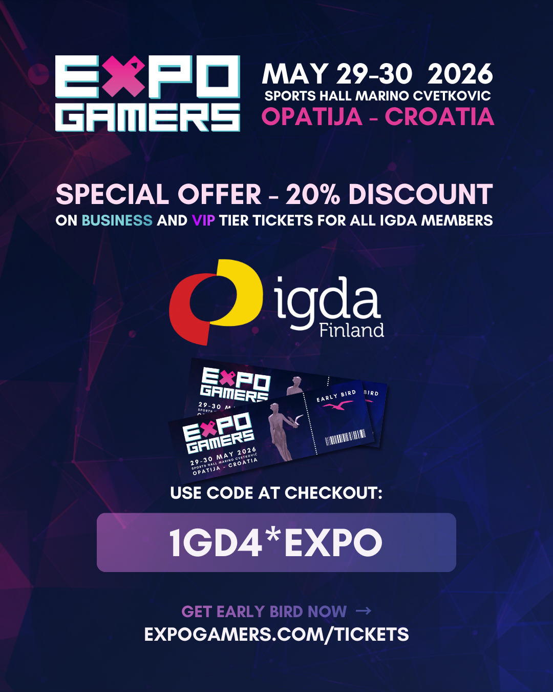 IGDA Finland members receive a 20% discount using the promo code 1GD4*EXPO when registering.