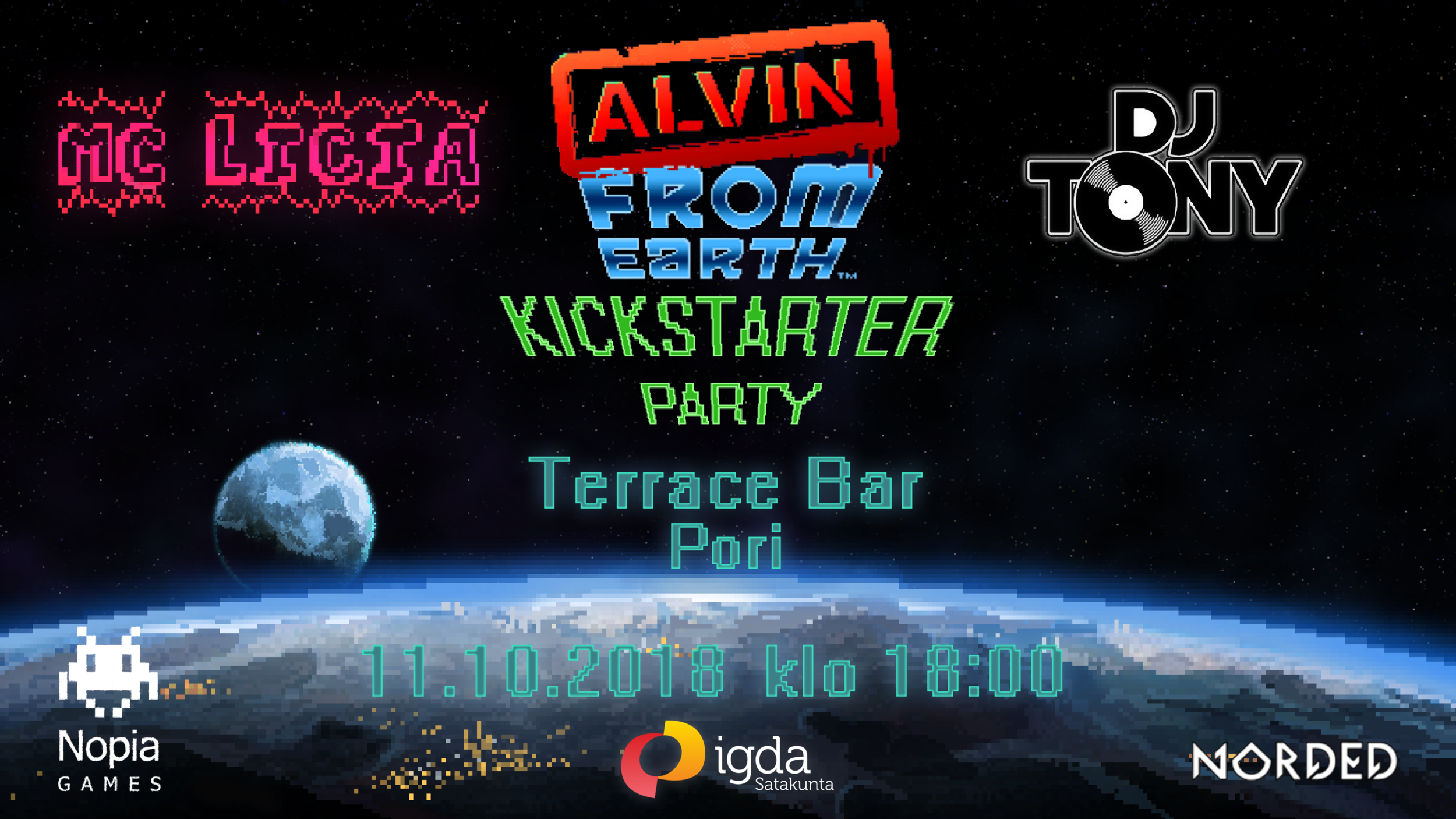 Come and celebrate the success of Alvin From Earth's Kickstarter campaign, as well as the first episode of the show, with Nopia Oy and IGDA Satakunta on Thursday, 11 October at 18:00 in Terrace Bar.