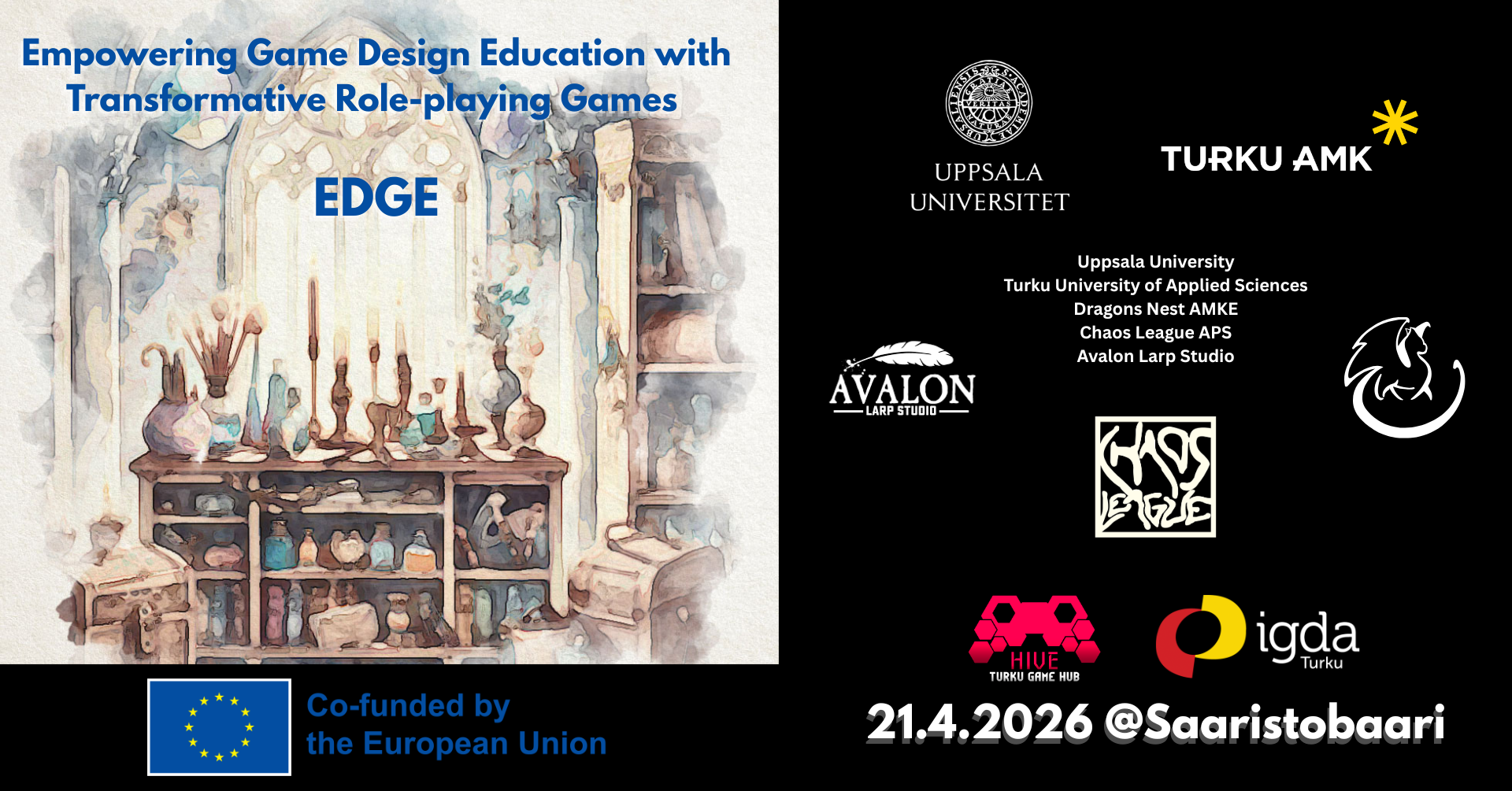The Erasmus EDGE Project is pioneering empowering game design education within the emerging field of Transformative Game Design. The project focuses on creating specialized educational materials for life-long learners in "helping professions"βincluding educators, therapists, youth workers, and spiritual directors.